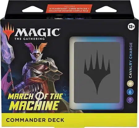 This March of the Machine Commander Deck set includes 1 ready-to-play deck of 100 Magic cards (2 Traditional Foil Legendary cards, 98 nonfoil cards), 10 specialty cards, a 2-card Collector Booster Sample Pack, 1 Foil-Etched Display Commander (a thick cardstock copy of the commander card with foil etched into the card’s border and art), 10 double-sided tokens, 1 deck box (can hold 100 sleeved cards), 1 Life Wheel, 1 special die, 1 strategy insert, and 1 reference card.